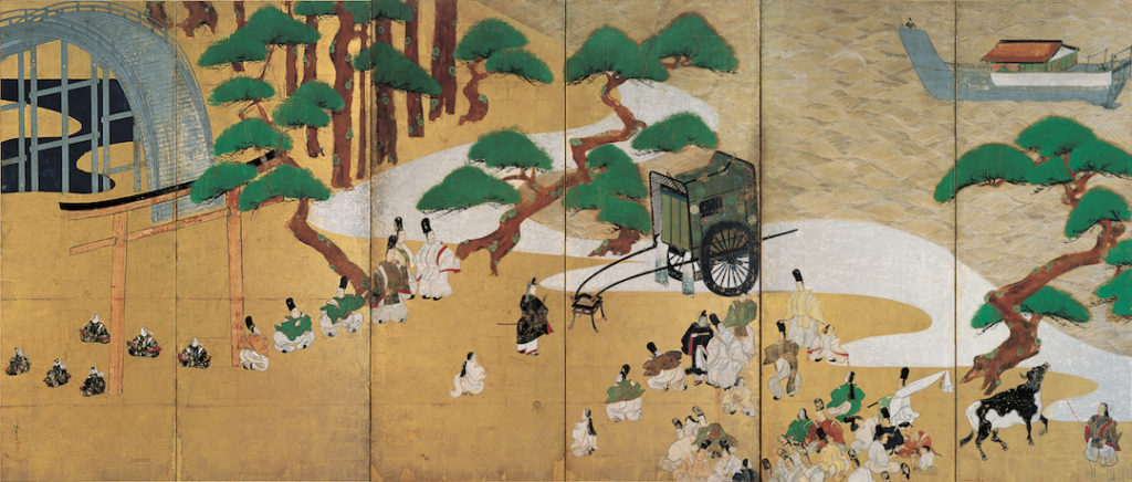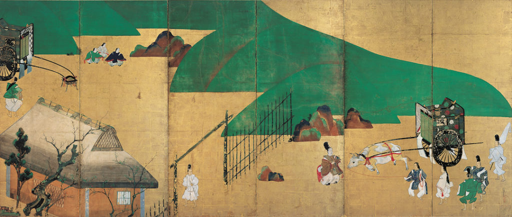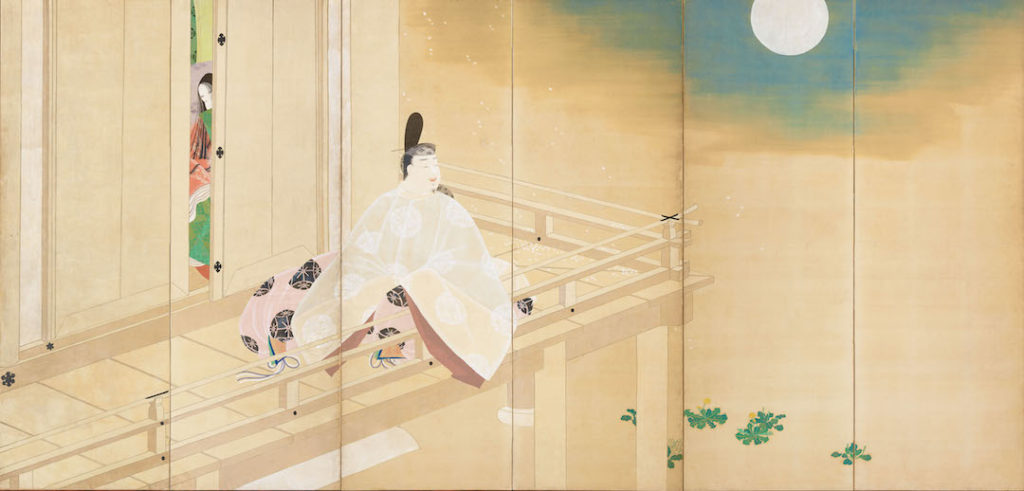 This silk hanging scroll shows Murasaki Shikibu as she is about to begin composing her masterpiece, The Tale of Genji. Painted by Tosa Mitsuoki in the 17th century, this work is on loan from Ishiyamadera Temple, where legend says Murasaki Shikibu first started writing. It is the first time this piece has been exhibited outside Japan.
